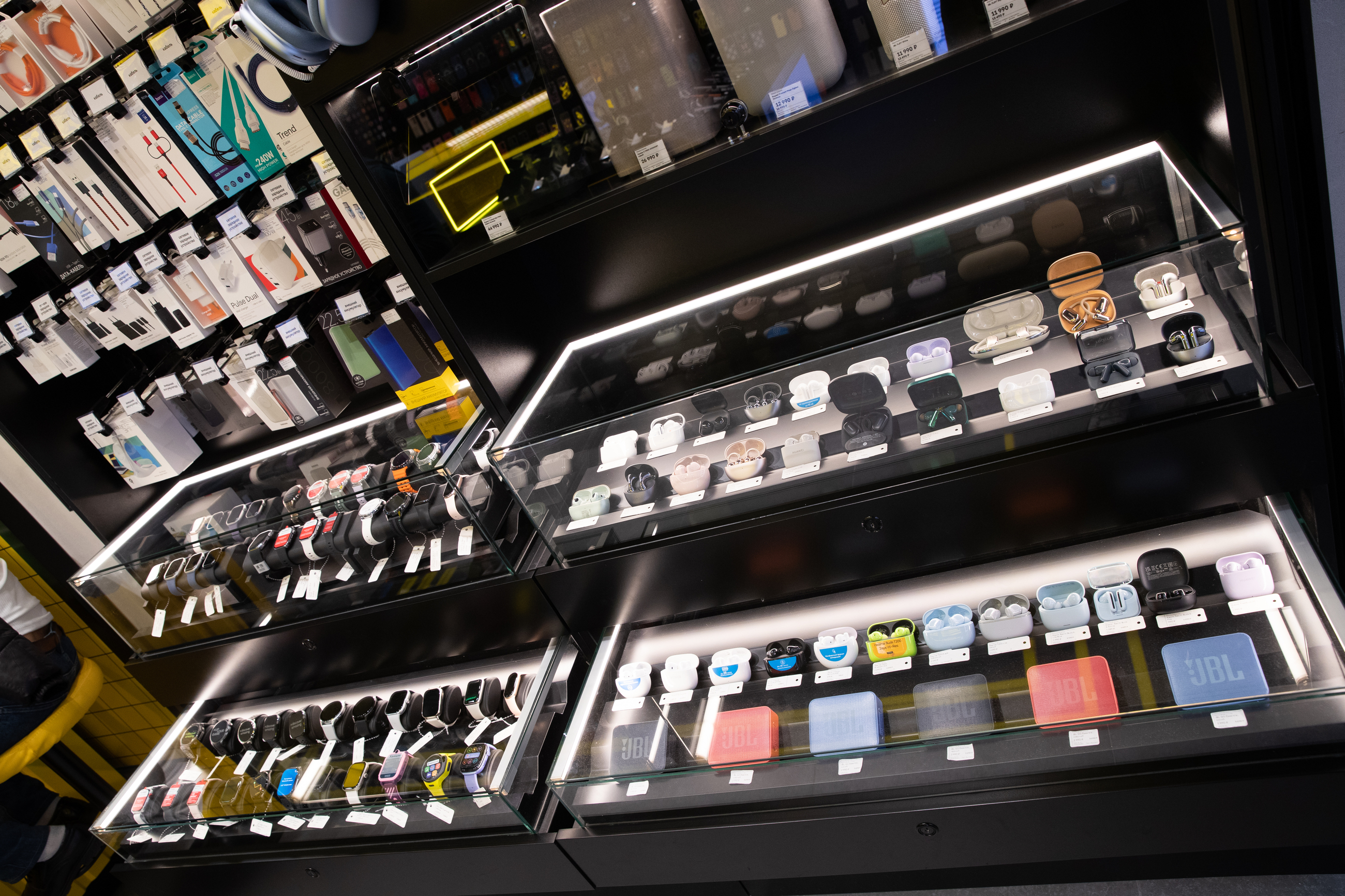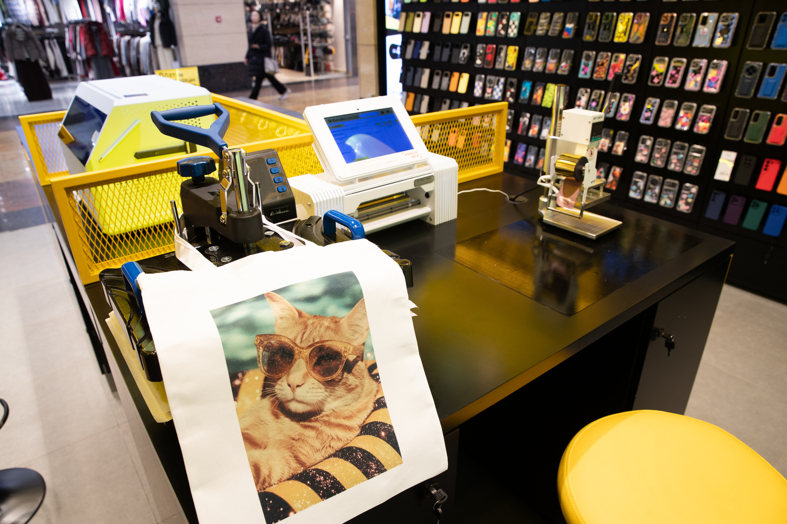 Один из ключевых элементов, определивших сценарий магазина, — центральный стол персонализации. Он не просто занимает место в центре зала, а формирует вокруг себя логику взаимодействия: здесь можно рассмотреть аксессуары, вместе с консультантом разработать кастомный дизайн, протестировать сервисы.